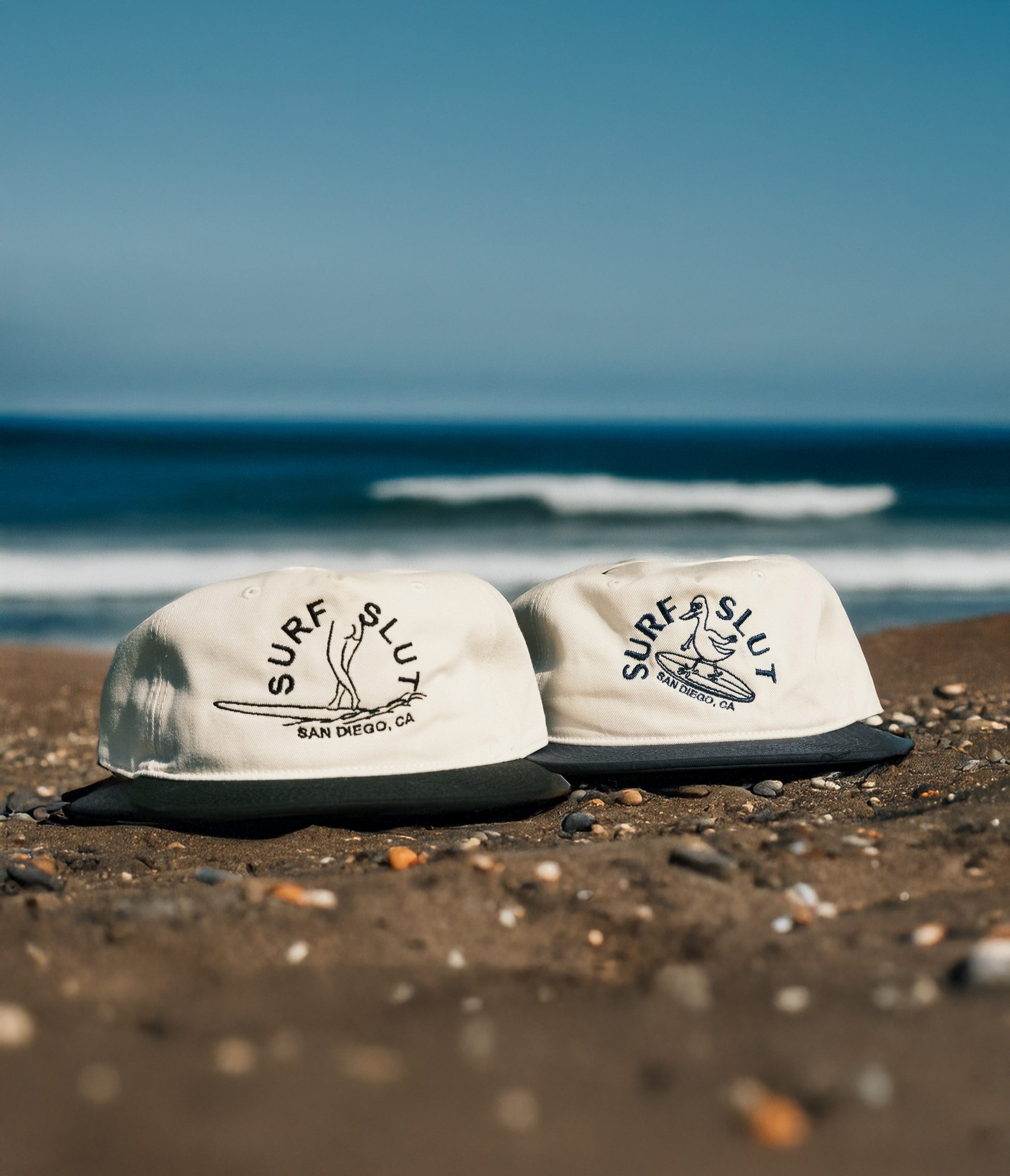 Your favorite surfslut logos back at it again. OG surfer girl and a fun new Silly Goose in honor of my favorite nude muse, Erin. Classic flat surfer cap.